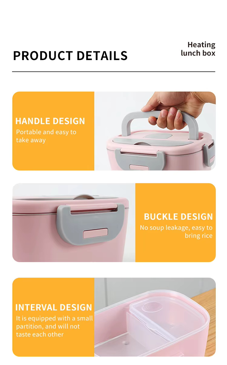 This new updated model electric lunch box with sides buckle locking, 60 watt 110V 220V 12V and for 24V truck available, smart 1.5L easy to carry, can be custom printed your own logo or brand on it.