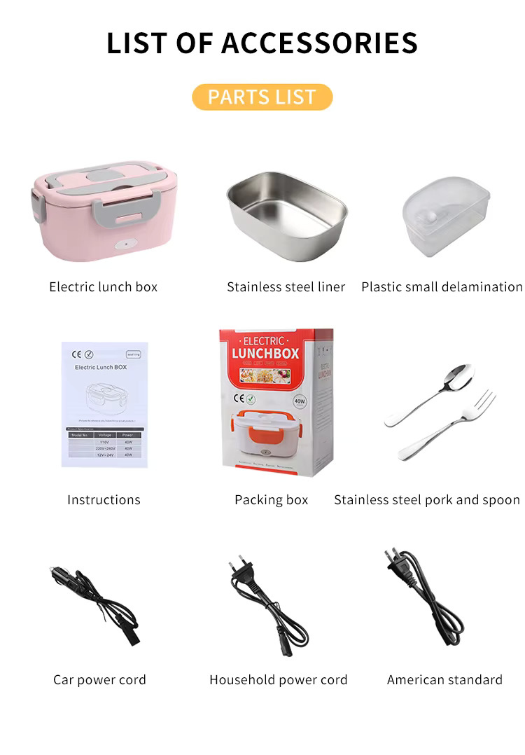 Item name: 1.5L electric heated lunch box Material: Food grade Plastic PP+ stainless steel Standard size: 245*125*90mm Power: 220V/50Hz, 110V/60Hz Watt: 60W Capacity: 1500ml Accessory: Spoon and fork Packing: 1 pc per paper box packaging | - Logo /design: customized - Normal colours:green,blue,red,orange,white,or custom - Heating time: It can reach 45-60 ℃ in 20-30 minutes, - The maximum temperature can reach 70 ℃ - Application: Popular in Home/Office/Car/etc.. - Function: Keep food warming & fresh Easy to clean Heating food Promotion, Gifts, Wedding, School, Travel, Friends, etc |